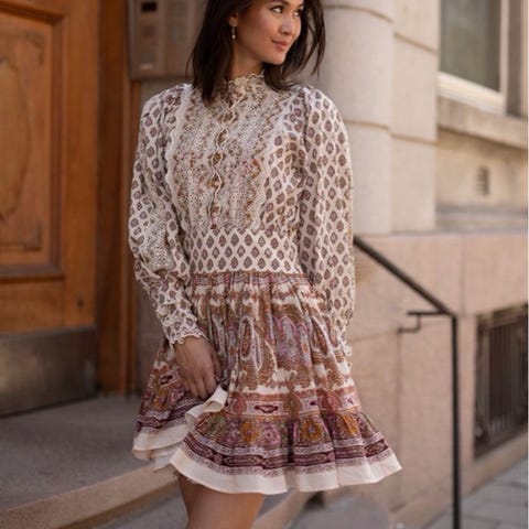 Chiffon Mini Dress fra byTimo er en lekker minikjole med bunnfarge i lyseblå og delikat blomsterprint i en mørkere blåfarge. Kjolen har markert liv med plisseringer, og vidt skjørt med A-fasong. V-hals med krage, knepping ned mot midjen og lange ballongermer med mansjetter. Fôret skjørt.