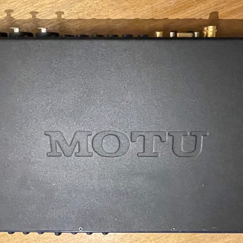 MOTU M4 USB lydgrensesnitt med flere innganger og utganger, inkludert balanserte og ubalanserte linjeutganger. Enheten har input monitor mix-funksjon og fargede nivåindikatorer for inngangssignal.