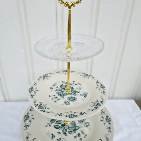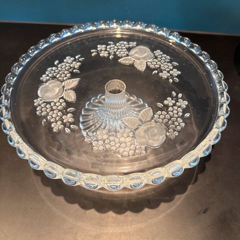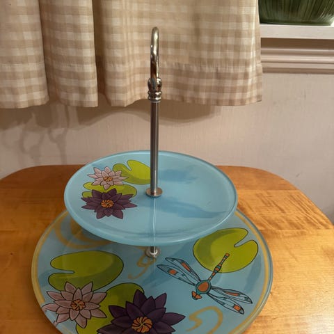 Nesten ubrukt to etg fat med vannliljer og øyenstikker. 30 og 20 cm i diameter. Sølvfarget senterpinne.