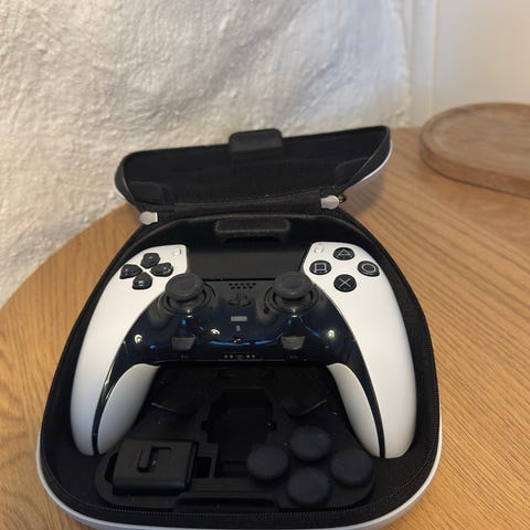 Sony PlayStation 5 spillkonsoll med hvitt design og medfølgende kontroller selges.