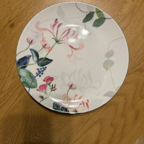 Magnor Glassverk middagstallerken med blomsterdekor. Tallerkenen har et mønster med ulike blomster i flere farger på hvit bakgrunn. Egnet for servering av mat. Selges 2 stk.