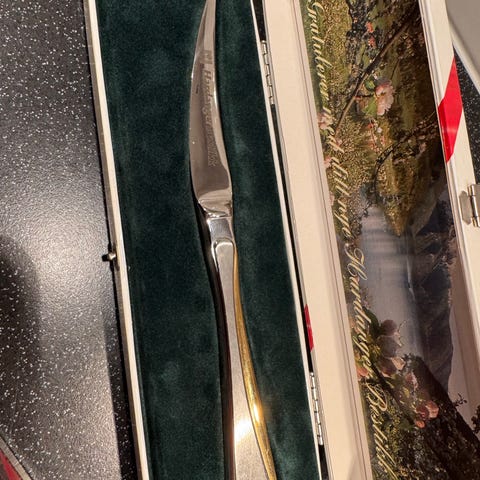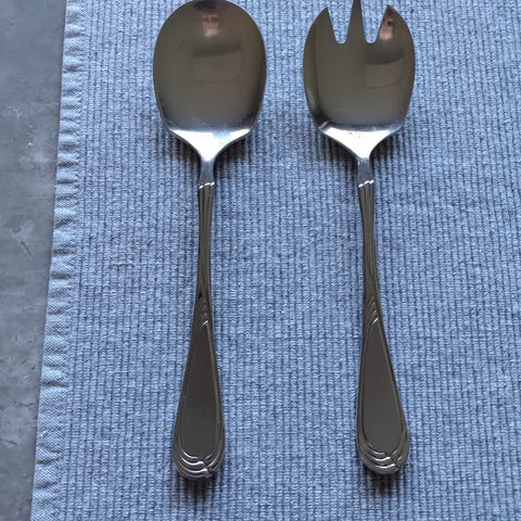 Serveringsbestikk og salatbestikk i Admiral, Hardangerbestikk blir solgt. Totalpris for alt 3000,-