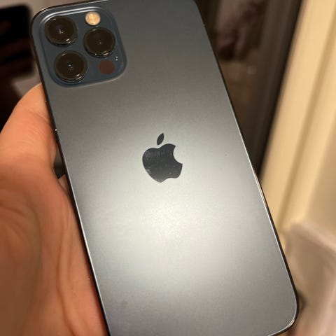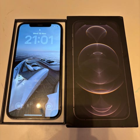 Apple iPhone 12 Pro mobiltelefon med 128 GB lagringskapasitet. Enheten har en svart farge. Skjermen og baksiden har betydelige skader med sprekker, spesielt i nedre hjørne på baksiden. Telefonen er designet for bruk med iOS-operativsystemet.funker fint alt funker