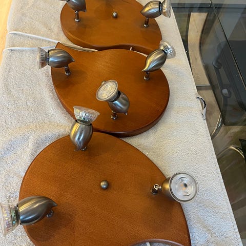 Tre taklamper med tre lyspunkt i hver selges. Base i heltre, for pære med liten sokkel.