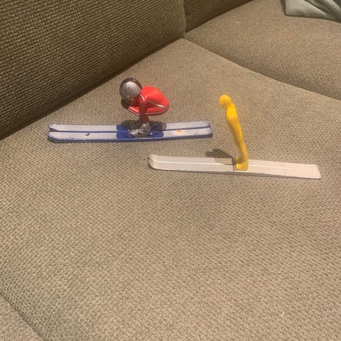 Langrenn og bob-bane figurer i metall. Følger med klistremerker. Kan brukes som pynt eller til å leke med i snø. Ubrukt.