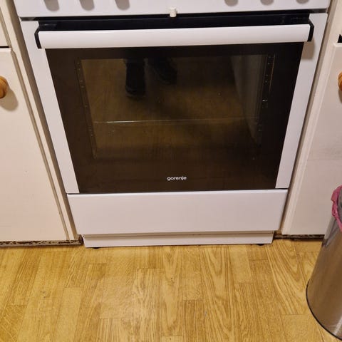 Klar for henting. Trenger en grundig vask, men fungerer som den skal. Gorenje komfyr med keramisk kokeplate. Komfyren har brytere for justering av varme og innstillinger, og et integrert ovnsrom med glassdør.