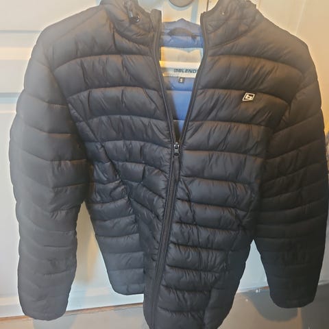 Blend jakke i godt fint stoff som virker som tåler en regnskur. Lange armer og sitter fint, litt slim fit- se bilder. Ser ny ut, uten bruksmerker eller noen andre flekker eller annet (men «hanken» til å henge den opp med er litt blitt litt lengre, og merkelappen er klippet bort) se bilde.