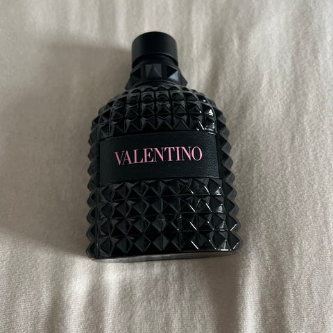 tømme Valentino Duftflaske med dekorativt mønster i glass. Flaske med svart hette, egnet for oppbevaring av parfyme eller duft. Du kan kjøp refill fra en annen butikk. Pris kan diskuteres da😊