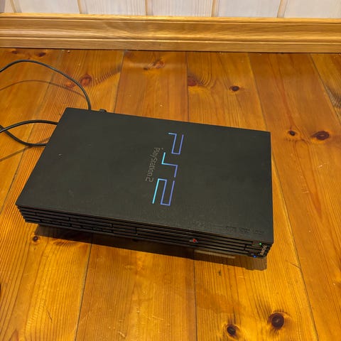 Sony PlayStation 2 Satin Silver spillkonsoll med en kontroller, AV-kabler, nettadapter og minnekort. Konsollen er i sølvfarge og inkluderer nødvendig tilbehør for tilkobling og bruk.