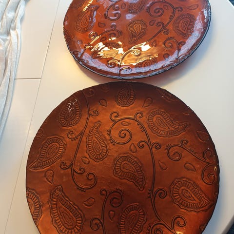 To pene tallerkener / serveringsfat i rustfritt stål selges samlet.