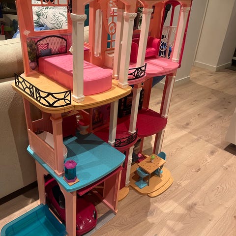 Min datter selger sitt Barbie Malibu hus. Det er et Barbie dukkehus som er sammenleggbart. Alle møbler som var med som nytt følger med. Fremstår som nytt.