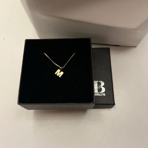 Bokstavsmykke fra Bjørklund i Gult Gull selges. Bokstavsmykke i gull. Kjede er forgylt, ikke massivt gull.