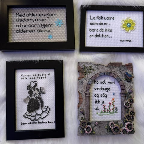 Brodert bilde med teksten "Gammel røy er også sukkertøy" og motiv av sukkertøy. Bildet er innrammet og kan brukes som dekorasjon.
