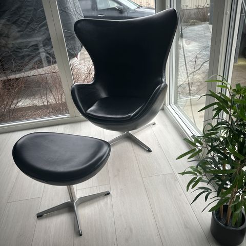 Selger en moderne og stilren lenestol i sort skinn, med matchende fotpall (puff). Stolen har et kult og gjennomført design, også på baksiden, noe som gjør den fin å ha stående midt i rommet.