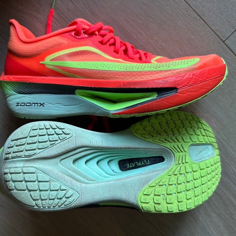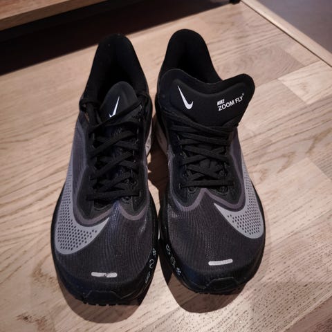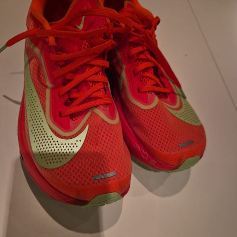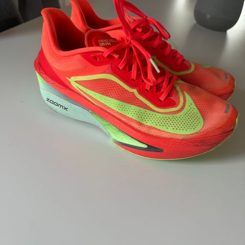 Nike Zoom Fly 6 i hvit og rosa. Kjøpt brukt på Finn, prøvd 5 km på mølle men blir for små til meg. Tidligere brukt 64 km. Str 40 og 25,5 cm.