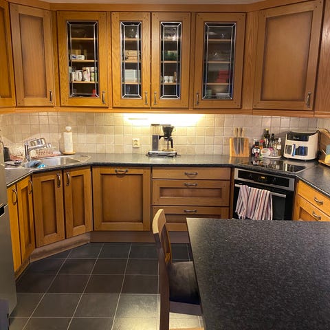 Demontert kjøkken seljast. Føl med platetopp og komfyr. Er ein del nye dørar til kjøkenet. Må ha nye foringar. Oppvasmaskin, ventilator og kjølehjørne inngår ikkje i prisen. Bør ha ny benkeplate. Måla er ca 225cm, 300cm og 180cm. 8000