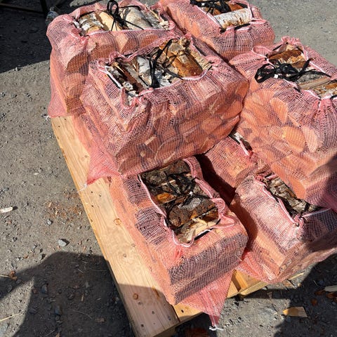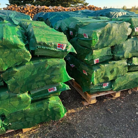 Selger 60 liters vedsekker med hovedsakelig bjørkeved
