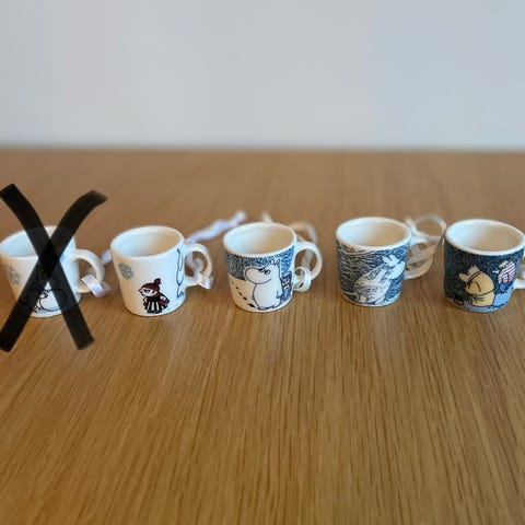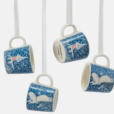 Hvert krus er 3 cm og har et silkebånd festet i hanken. Minikoppene kan brukes til pynt og dekorasjon på juletreet eller på bar kvist.