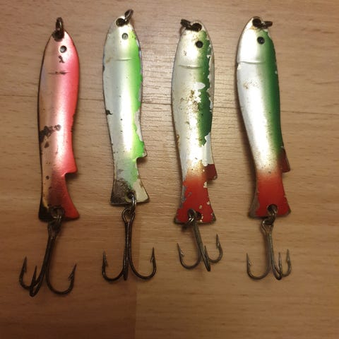 Fra toppen: 2 st Falkfish Kingtrout, 2 st Dam Effzett, 2 st Ryobi, 1 st Krokodile (litet slitasje), 1 st Abu Mörrumsdraget, 1 st umerket. Kan sendes.
