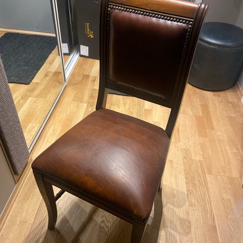 Spisestuestoler med skinntrekk i sete og rygg. Fra storhusholdning Berg & Dahl as.