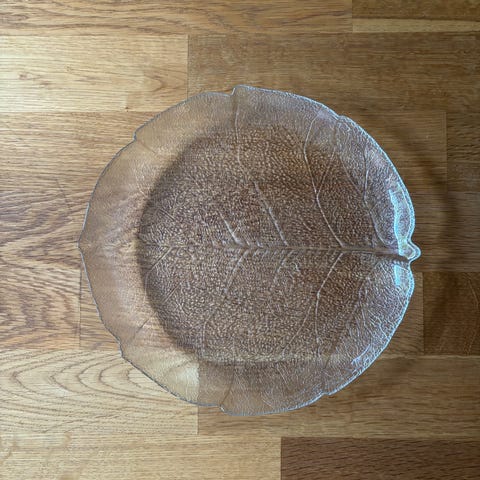 Kakefat i klart glass med mønster. Fatet er på stett. Materialet er glass, og designet har et veldig pent og dekorativt bladmønster.