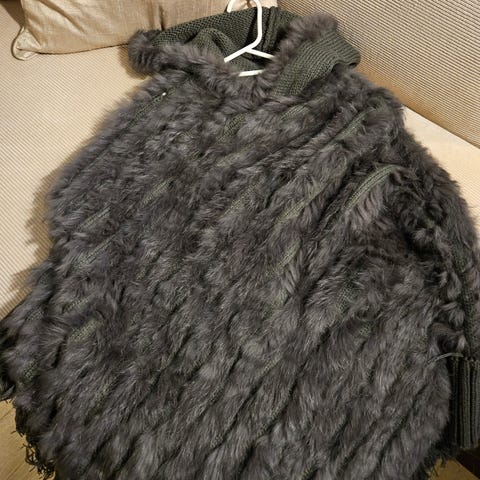 dame poncho/kappe med hette og pelskrage i brun farge. Ponchoen har en løs passform og er laget for å gi ekstra varme og komfort. Passer til bruk i kaldere vær. Kan fint brukes i minusgrader