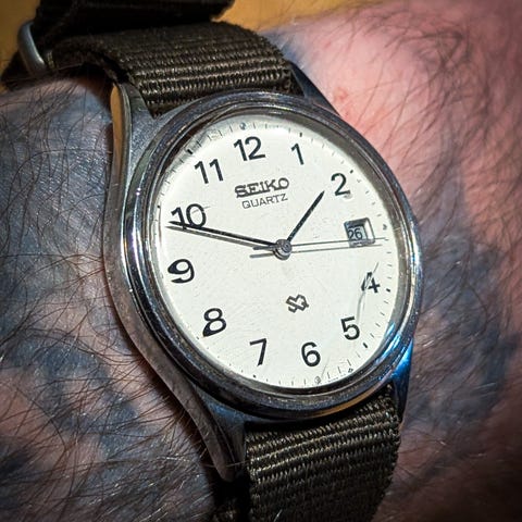 Vintage Seiko quartzklokke med klassisk rektangulær kasse og blå skive. Klokken står, trolig kun tomt batteri. Selges uten garanti.