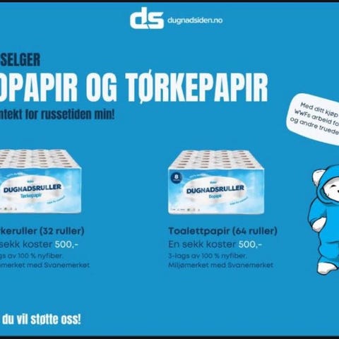 Jeg selger dopapir i dugnad for 550kr pr sekk🤍Kan leveres på døra i Kristiansand området!