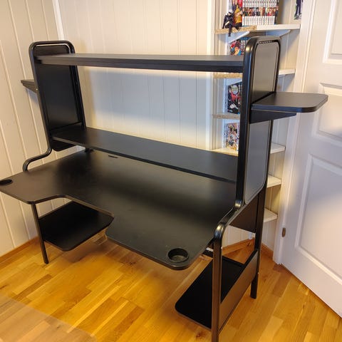 Gameing pult fra IKEA, fredde, selges. Nyprisen 3500. Selges til 1000. Se siste bilde for å se hvilke hyller som er tatt av. Pulten er demontert for lettere transport.