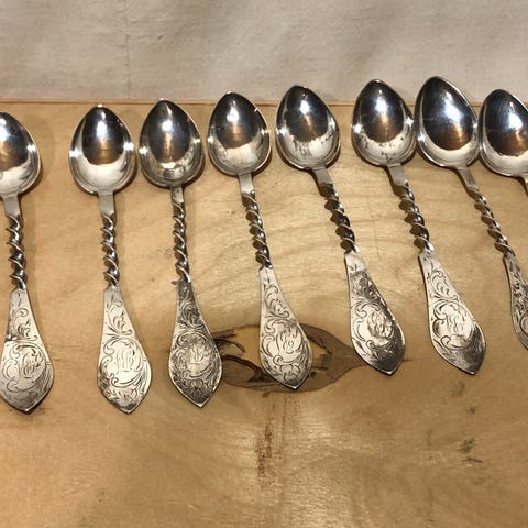 Sett med 6 antikke danske sølvskjeer fra 1923. Ekte sølv, Stempelet har et merke fra København by, som ble brukt i perioden 1893 til 1928.