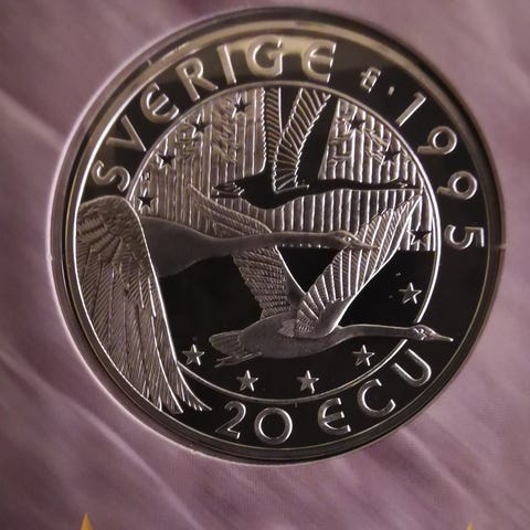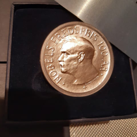 Norges Bank 100 Kroner sølvmynt fra 2011. Mynten er laget av sølv med en vekt på 334,4 gram og en renhet på 99,9 %. Mynten er utgitt i forbindelse med Nobels fredspris og leveres i originalt presentasjonsetui.