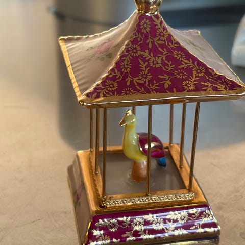 Elegant smykkeskrin i ekte fransk porselen fra Porcelaine de Paris. Skrinet har bølget form, hengslet lokk i forgylt metall og nydelig håndmalt blomster- og sommerfuglmotiv både utvendig og innvendig. Klassisk fransk stil, laget som dekorativ brukskunst.