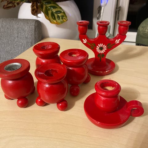 Veldig fine som juledekor, på hylle, bord eller i vinduskarm. Bruksspor og litt slitasje, spesielt innvendig (se bilder). Selges som sett og som de er.