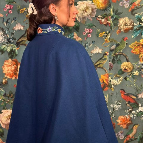 Jakken har et rutemønster og dobbeltradet knappestilling.