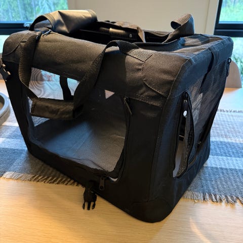 Buret har en dør med låsemekanisme og er egnet for transport eller oppbevaring av hunder. Åpning på kortside og langside