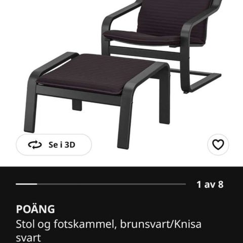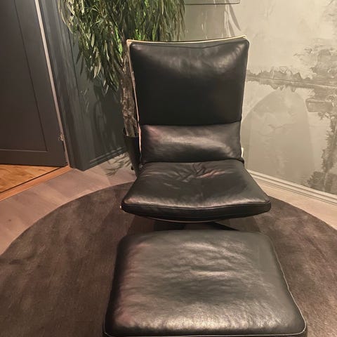Fin IKEA lenestol med fotskammel selges. Cognac farget skinn. Denne ble kjøpt av meg i 2014. Noe begynnende slitasje på sitteputekant og på putekant på fotskammel.