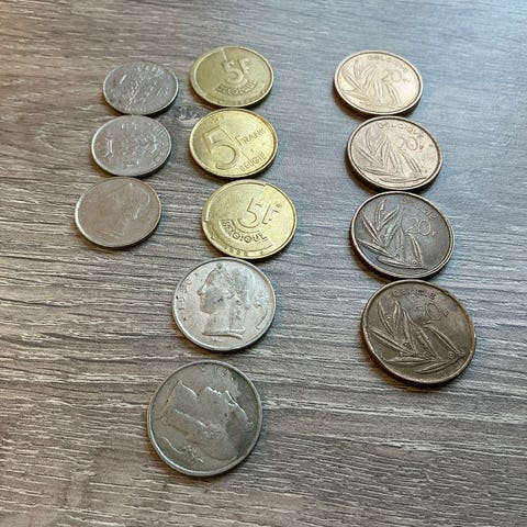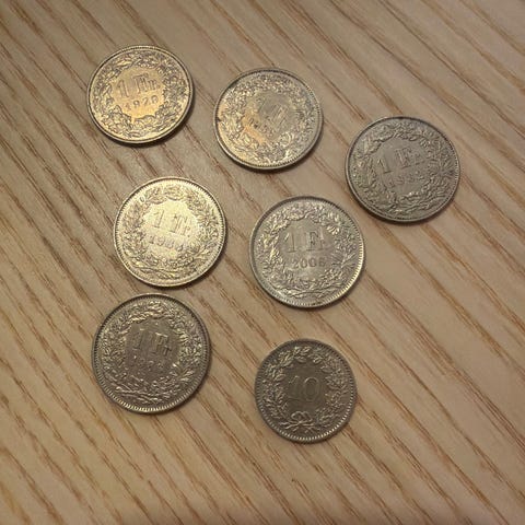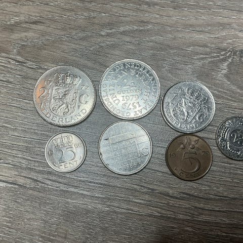 Samling av mynter i forskjellige størrelser og materialer. Mynter inkluderer ulike valører og design, med noen som har detaljer som portretter og symboler. Passer for samlere eller som referansemateriale om mynthistorie.