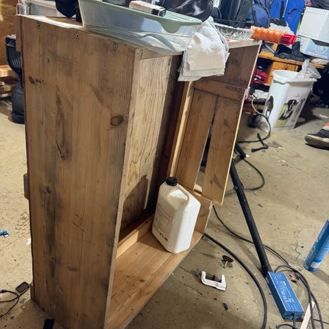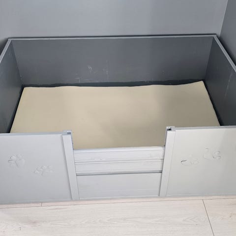 Stor og trygg valpekasse/ innebur med vaskbar, avtagbar bunn i malt treverk.