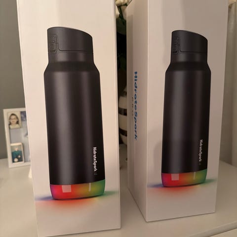 AeroPress vannflaske i blå farge med tidsmarkeringer for daglig vanninntak. Flaske i plastmateriale med skrukork og bærestropp. Egnet til å holde oversikt over vanninntak gjennom dagen.