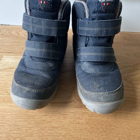 Viking barnesko for gutt i størrelse 27. Skoene er mørkeblå og har borrelåslukking for enkel tilpassing. Materialet ser ut til å være slitesterkt med polstret innside for komfort.