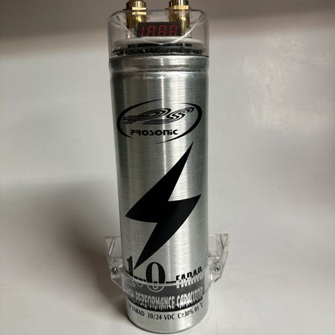 Stinger SPC5010 kondensator med display, kapasitet på 10 Farad. Hybridtype designet for stabil energilagring og spenningsstøtte.
