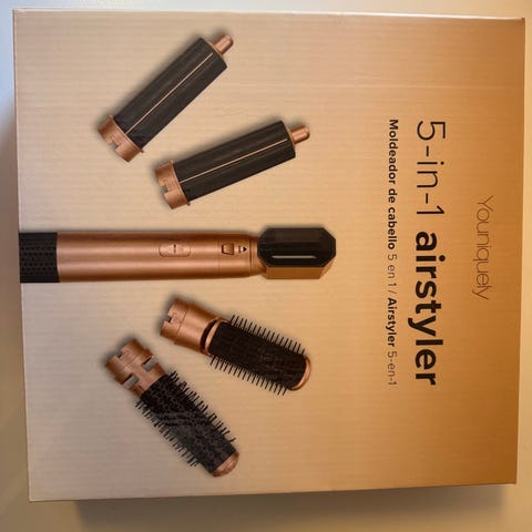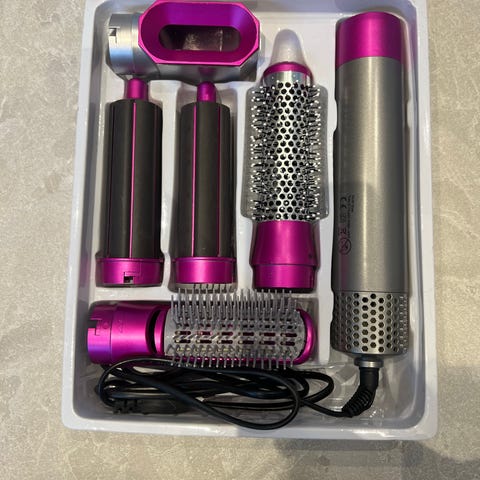 hårstyler med flere børste- og stylingtilbehør. Enheten har et grått og rosa design og leveres med ulike runde børster og stylingverktøy for hårforming og volum. Passer til hjemmebruk for styling av hår.