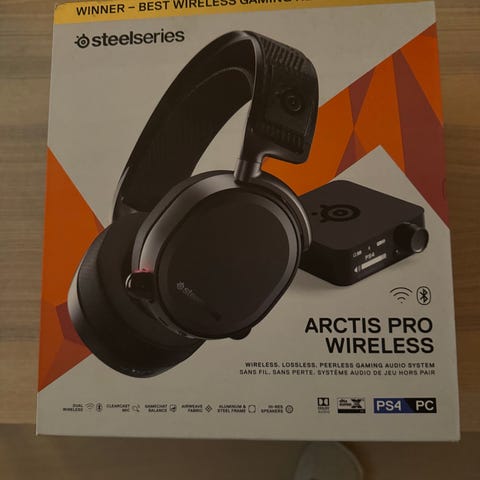 SteelSeries Arctis Pro Wireless hodetelefoner i svart og hvit med innebygd ClearCast-mikrofon og DTS Headphone:X v2.0 lydteknologi. Hodetelefonene har neodymmagneter og Hi-Res lyd som dekker frekvenser opp til 40 000 Hz. Inkluderer GameDAC for tilkobling og enkel volumjustering og lydinnstillinger. Kan kobles opp til pc og playstation