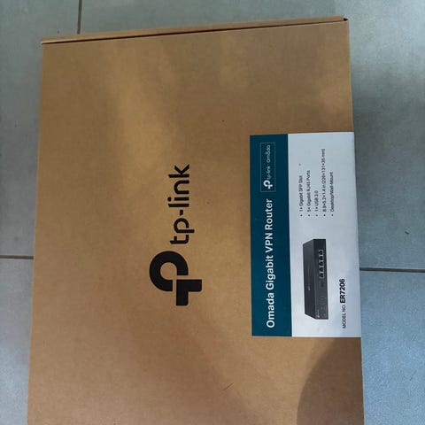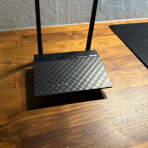 D-Link Router med tilbehør inkludert nettverkskabel, strømadapter og monteringsbrakett. Enheten har et kompakt design og er beregnet for bruk i datanettverk.
