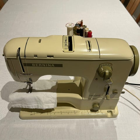 Bernina 830 symaskin integrert i et trebord. Maskinen har mekanisk betjening og en lys grønn farge. Bordet har oppbevaringsplass for tilbehør og kan lukkes for å skjule symaskinen når den ikke er i bruk.