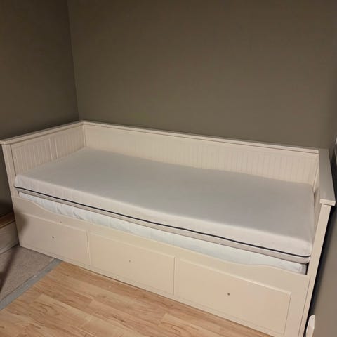 Flott Ikea Hemnes dagseng i farge gul. Gulfargen er nokså lys, og ikkje så skarp som den kan framstå på bilete. Pent brukt, einaste bruksmerket er litt slitasje der sengehest er montert. Senga kan trekkast ut til å bli ei dobbeltseng. Tre solide gode skuffer under senga. Må hentast i Hagavik.