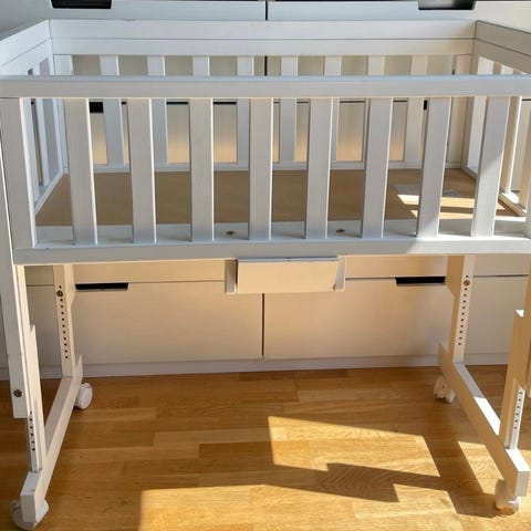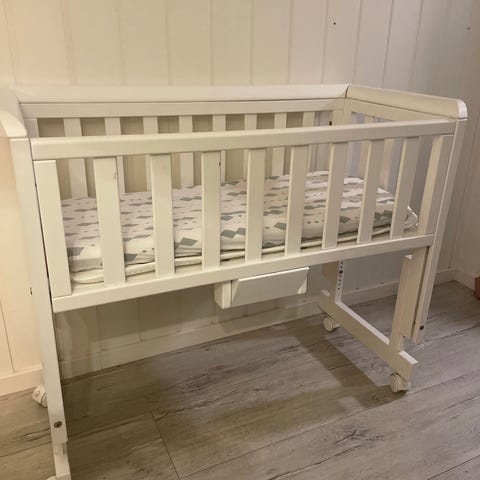 Troll sideseng I god stand. Den har noen få merker, men er i veldig god stand. Super seng de første 6 månedene. Kan justeres i høyden så den passer foreldresengen. Følger med madrass, brukt av ett barn, aerosleep madrass. Aerosleep er produsert for å gi maksimal pusteevne og redusere kvelningsrisiko