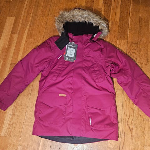 Denne varme, lange reimajakka er nesten ubrukt, men mangler dessverre hetta, som forsvant på skolen. Den er likevel et røverkjøp. Ingen slitasje og utrolig pen.