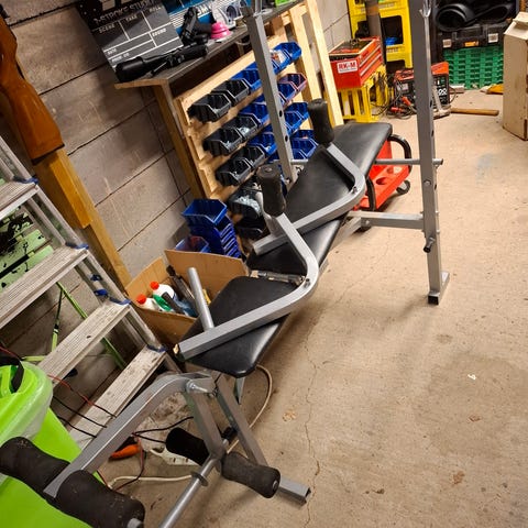 Selger pent brukt Gym Tech benkpress. Benken har justerbar ryggstøtte og apparat for leg Extentions eller leg curls. Følger med stangen på bildet