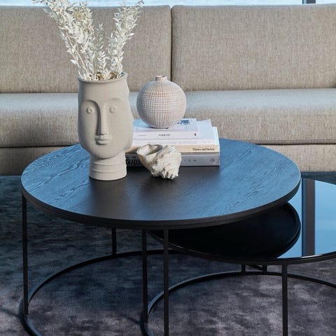Muran rundt sofabordsett Ø90 H45.5 cm lakkert eikefiner hvitpigmentert med understell stål svart.